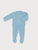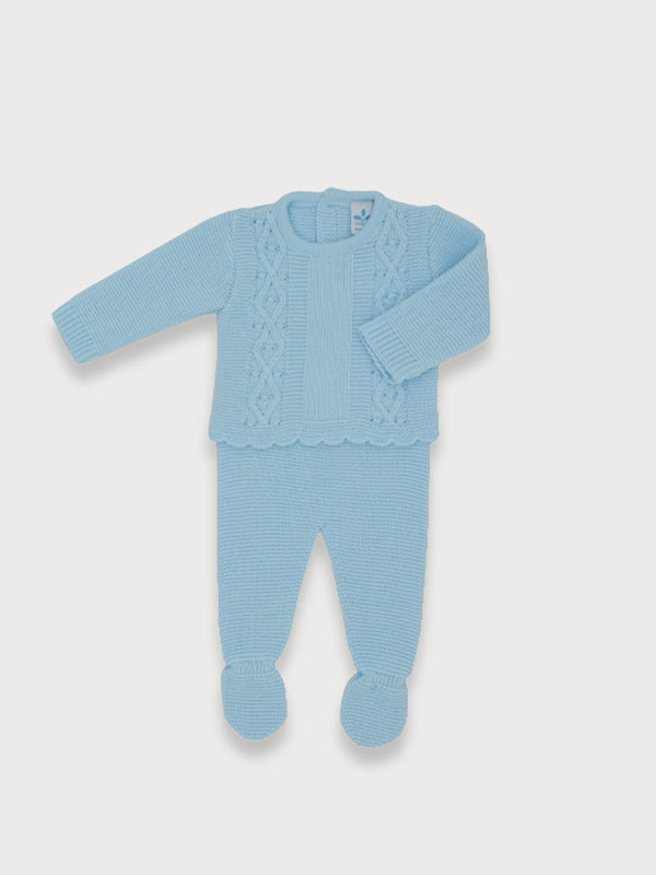 Newborn 2-piece sky blue knit set. It includes a long-sleeve sweater and matching footies. The sweater fastens with buttons on the back. The footies are gently elasticated around the waist.
