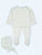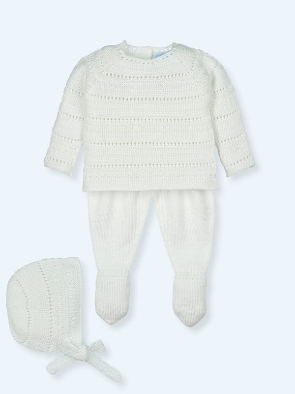 Neutral white 3-piece knit set. It includes a long sleeve sweater, matching footies and a bonnet. The sweater fastens with buttons on the back. The footies are gently elasticated around the waist. Matching blanket available.