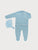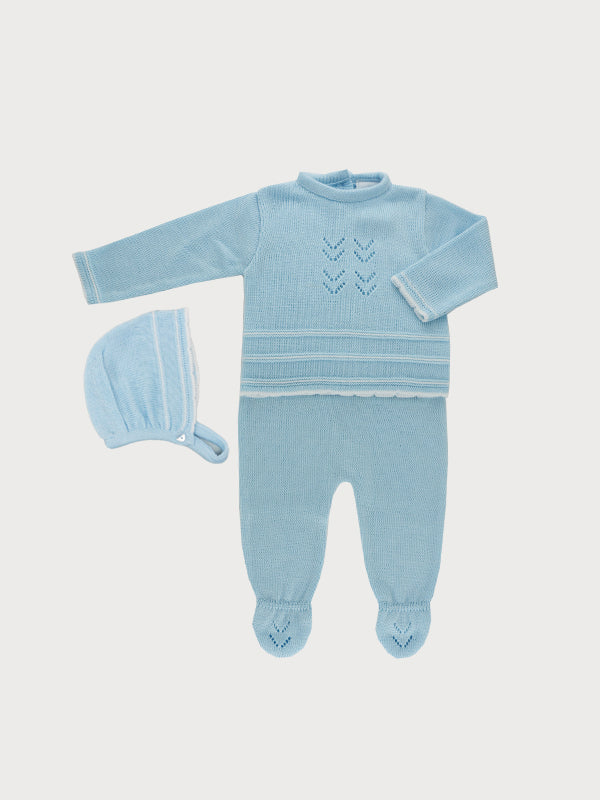 Newborn 3-piece sky blue knit set. It includes a long-sleeve sweater, matching footies and a bonnet. The sweater fastens with buttons on the back. The footies are gently elasticated around the waist. The bonnet adjusts with a button.