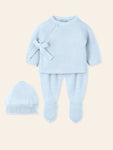 Beautiful gift box for a newborn baby boy. It includes a 3-piece baby blue knit set (long-sleeved sweater, matching footies and hat), a matching blanket and a rattle. The kimono sweater ties on the side, allowing for easy changes.