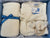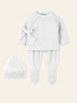 Beautiful unisex gift box for a newborn baby. It includes a 3-piece white knit set (long-sleeved sweater, matching footies and hat), a matching blanket and a rattle. The kimono sweater ties on the side, allowing for easy changes.