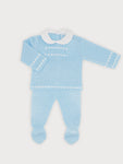 Two-piece sky-blue knit set for baby boys. It includes a long-sleeved sweater and footies. The top features a white fabric Peter Pan collar, and it fastens with buttons on the...