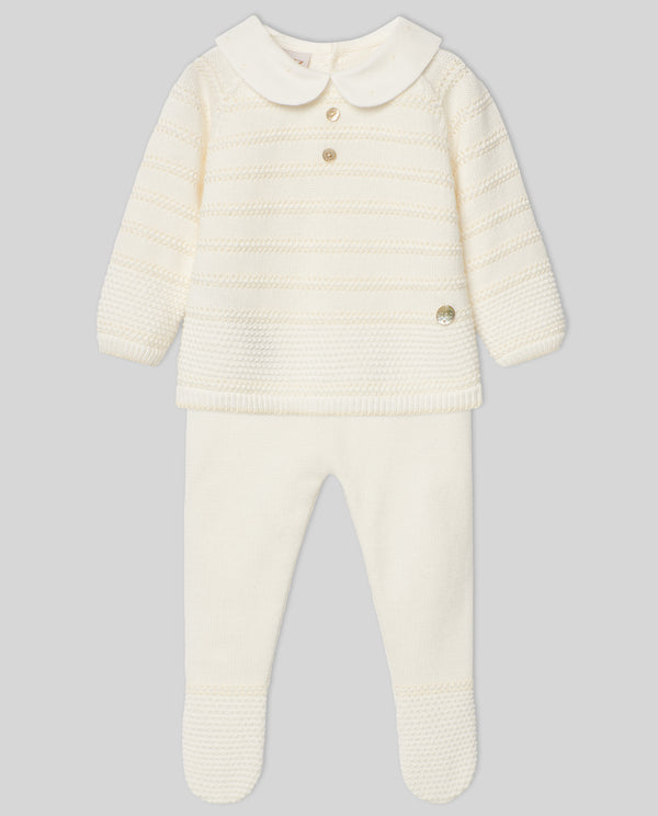 Two-piece cream knit set. It includes a long-sleeved sweater and footies. Knitted in soft cotton, the top features a Peter Pan collar and two decorative mother-of-pearl buttons. It fastens with buttons on the back. The footies are gently elasticated around the waist.