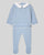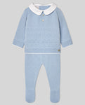 Two-piece cloud blue knit set for baby boys. It includes a long-sleeved sweater and footies. Knitted in soft cotton, the top has a white Peter Pan collar and is adorned...