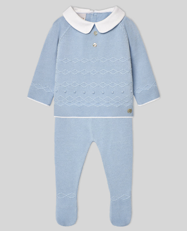 Two-piece cloud blue knit set for baby boys. It includes a long-sleeved sweater and footies. Knitted in soft cotton, the top has a white Peter Pan collar and is adorned with two faux mother-of-pearl buttons on the front. It fastens with buttons on the back. The footies are gently elasticated around the waist.