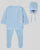 Three-piece cloud blue knit set for baby boys. It includes a long-sleeved sweater, footies and a bonnet. Knitted in soft cotton, the top fastens with buttons on the shoulder and is adorned with a mother-of-pearl logo on the front. The footies are gently elasticated around the waist.