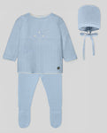 Three-piece cloud blue knit set for baby boys. It includes a long-sleeved sweater, footies and a bonnet. Knitted in soft cotton, the top is adorned with a mother-of-pearl logo on the front. It fastens with buttons on the back. The footies are gently elasticated around the waist.