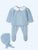 Cloud blue 3-piece knit set. It includes a long-sleeved sweater, matching footies and a bonnet. The sweater features a white cotton Peter Pan collar. It fastens with buttons on the...