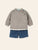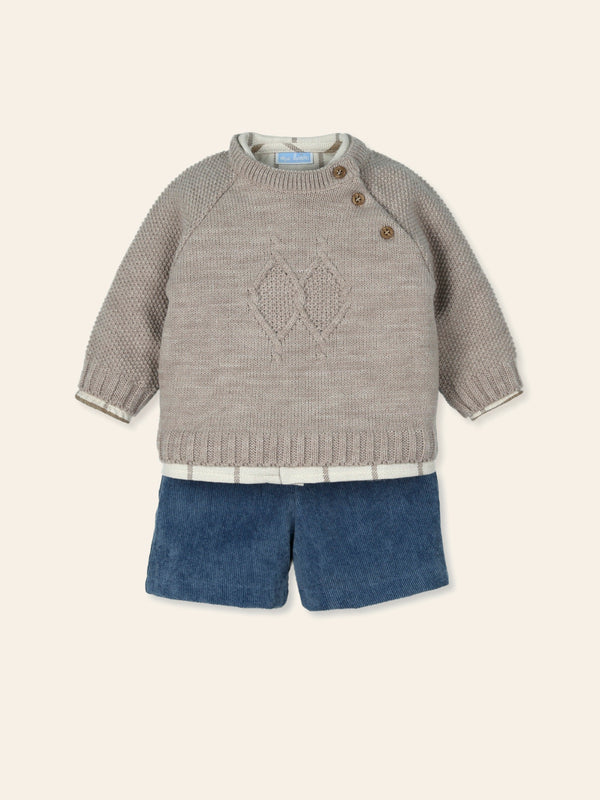3-piece boy set, it includes a shirt, shorts and sweater. The long-sleeved beige plaid shirt fastens with buttons on the front. The navy corduroy shorts have an elasticated waist. The light brown sweater has an engraved motif on the front and wooden buttons on the shoulder.