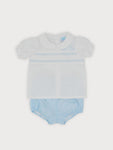 Smocked bloomer set for baby boy. The short-sleeved white blouse features a blue smocked detail across the chest and a Peter Pan collar. It has puffed elasticated details and it...