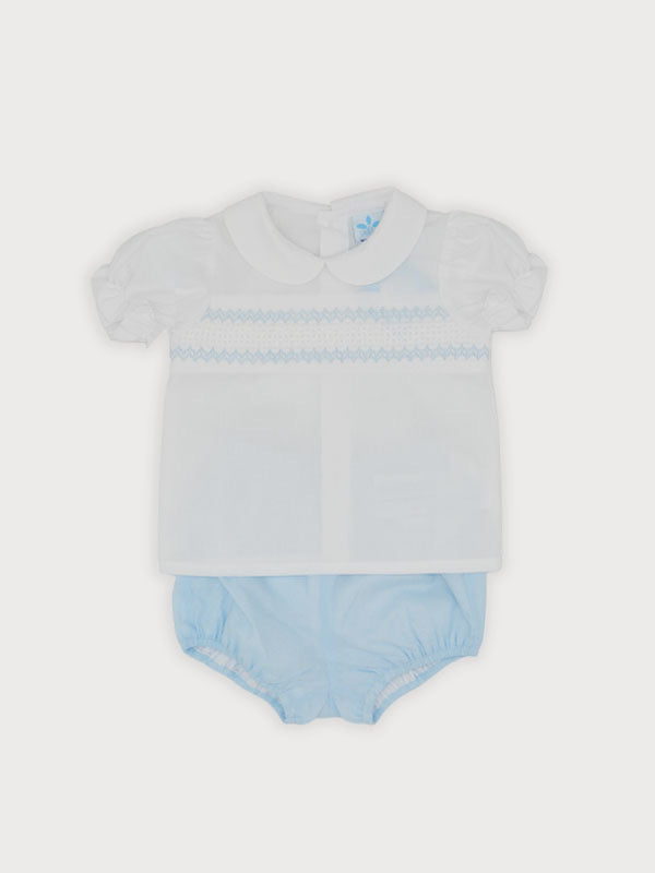 Smocked bloomer set for baby boy. The short-sleeved white blouse features a blue smocked detail across the chest and a Peter Pan collar. It has puffed elasticated details and it fastens on the back with buttons. The blue bloomers are elasticated around the waist and leg openings.
