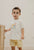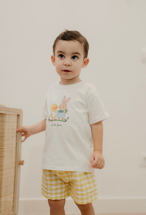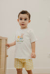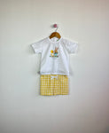 Comfy summer boy set, it includes a white cotton shirt and shorts. The white shirt has a cute animal print. The white and yellow gingham shorts are elasticated around the waist.