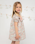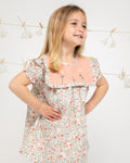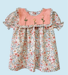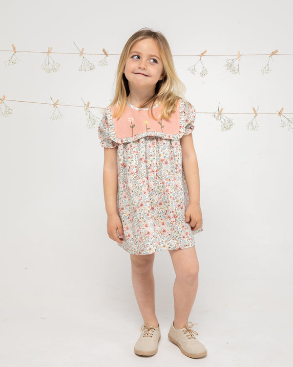 Cute floral dress in pink and green pastel shades. It features a beautiful, embroidered bib collar, and short puffed sleeves. It fastens on the back with buttons.