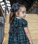 This hand-smocked dress in a classic navy blue and green tartan fabric is perfect for the holiday season. With puffed sleeves and a white Peter Pan collar, it features a beautiful hand-smocked panel. The dress fastens on the back with mother-of-pearl buttons and a bow.
