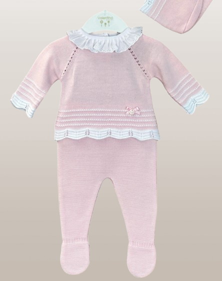 Newborn 3-piece baby pink knit set. It includes a long-sleeved sweater, matching footies and a bonnet. The sweater has a white cotton ruffled collar and a white knit trim. It fastens on the back with buttons. The footies are gently elasticated around the waist. The bonnet adjusts with a button.