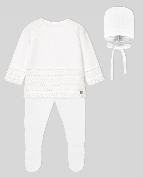 Three-piece white knit set for baby boys and girls. It includes a long-sleeved sweater, footies and a bonnet. Knitted in soft cotton, the top features an intricate detail and is adorned with a mother-of-pearl logo on the front. It fastens with buttons on the back. The footies are gently elasticated around the waist.