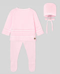 Three-piece pink knit set for baby girls. It includes a long-sleeved sweater, footies and a bonnet. Knitted in soft cotton, the top features an intricate detail and is adorned with a mother-of-pearl logo on the front. It fastens with buttons on the back. The footies are gently elasticated around the waist.