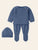 Dark blue 3-piece knit set. It includes a long-sleeved sweater, matching footies and a hat. The sweater fastens with buttons on the back. The footies are gently elasticated around the waist. Matching blanket available.