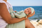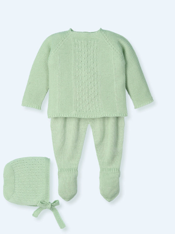 Unisex 3-piece apple green knit set. It includes a long-sleeve sweater, matching footies and a bonnet. The sweater fastens with buttons on the back. The footies are gently elasticated around the waist. Matching blanket available.