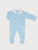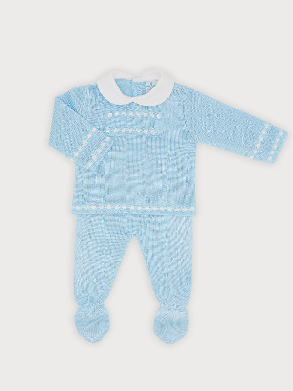 Two-piece sky-blue knit set for baby boys. It includes a long-sleeved sweater and footies. The top features a white fabric Peter Pan collar, and it fastens with buttons on the back. The footies are gently elasticated around the waist.