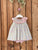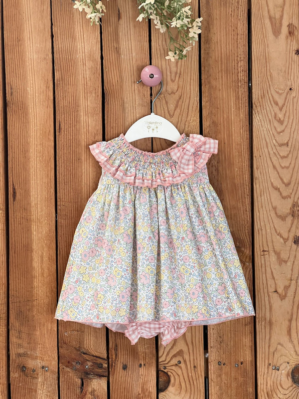 This toddler girl dress combines a beautiful pink liberty fabric with a pink and white gingham fabric, creating a contrast we love. The dress has a double ruffled smocked collar in both fabrics, and it is adorned with a bow in the pink and white gingham fabric. The bloomers are also made in the gingham fabric. The dress fastens on the back with buttons.