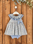 Cute cotton dress for toddler girl. Made in a blue floral fabric, this sleeveless dress features white and blue gingham fabric details in the double ruffled collar, a frontal bow and the bloomers, creating a cute contrast. It fastens with buttons on the back. There is a matching option for baby girl.