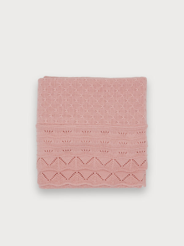 Knit blanket with openwork detail. Available in pastel pink and white.