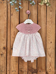 Knit and woven dress for baby girl. Made in a white fabric with a pink floral print, the top part is knitted in a powder pink color. The dress comes with matching bloomers, and it fastens on the back with buttons. There is a matching option for toddler girls.
