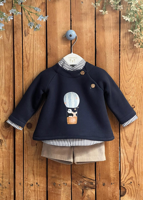 3-piece boy set, it includes shirt, shorts and sweatshirt. The long-sleeved shirt is made in a blue navy and white striped fabric. It fastens with buttons on the front. The beige corduroy shorts are elasticated around the waist for additional comfort. The shorts are elasticated around the leg openings up to size 18 months. The navy-blue sweatshirt features a cute hot-air balloon print on the front and wooden buttons on the shoulder.