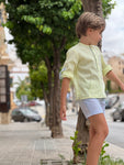 Cute shorts set for boys. Made in lightweight seersucker fabric, the long-sleeved white and lime yellow gingham dress has no collar, and it fastens with 3 buttons on the front. It features a frontal pocket. The blue and white striped shorts, also made in seersucker, are elasticated around the waist for additional comfort.