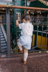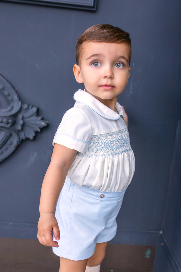 This formal set for toddler boys features a shirt and shorts. The short-sleeved ivory shirt features a Peter Pan collar and a gorgeous hand smocked light blue panel. It fastens on the back with buttons. The pale blue shorts are elasticated around the waistline and feature pockets.