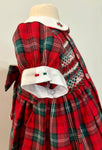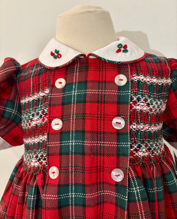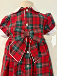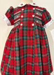 This hand-smocked dress in a classic red and green tartan fabric is perfect for the holiday season. It features a frontal panel with four faux buttons and beautiful hand smocking...