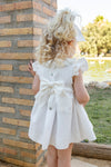 This hand-smocked ivory dress is perfect for any special occasion or ceremony. The front of the dress is pleated and has a beige hand-smocked detail. It features a ruffled collar with beige smocking. The dress has frill sleeves, and it ties on the back with a bow.