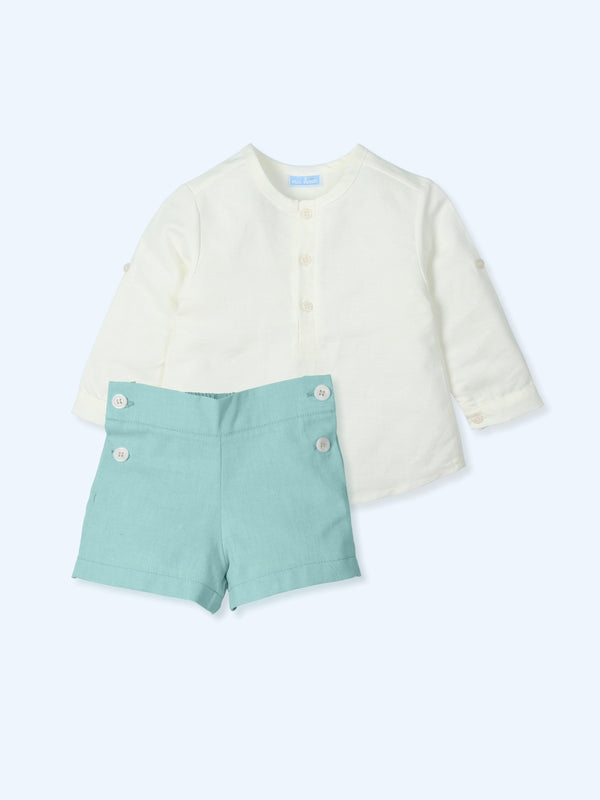 Shirt and shorts boy set. The white collarless cotton voile shirt features long sleeves that can be rolled up, and three buttons on the front. The cotton green shorts feature 4 buttons on the front.