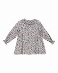 Traditional toddler girl dress in a beautiful pink, blue and burgundy floral print. It has an embroidered detail on the chest and a ruffled collar. The dress has long sleeves with elasticated cuffs and it fastens on the back with buttons. It comes with matching bloomers.