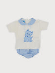 2-piece bloomer set for baby boys, it includes a short-sleeved knitted sweater and bloomers. The white lightweight sweater features a Peter Pan collar and an embroidered dog on the front in a white and blue gingham fabric that matches the bloomers. It fastens with buttons on the back. The bloomers are made in a white and blue gingham fabric and are elasticated around the waist and leg openings.