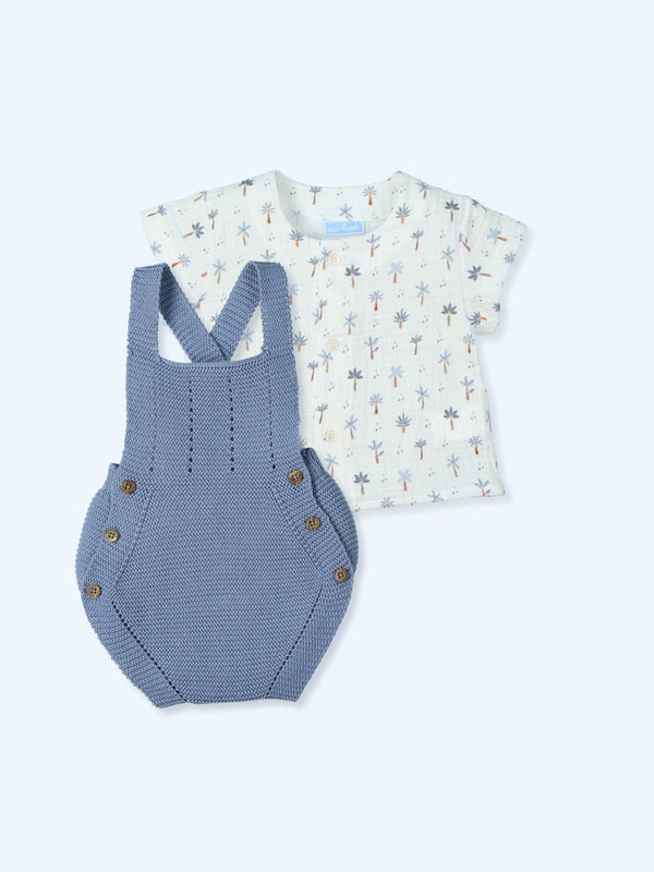 Blue dungarees set for baby boys. The knitted dungarees have cross back straps and fasten on the front with wooden buttons. The short-sleeved white collarless shirt is made in a soft and cool cotton, and it features a cute palm trees print. It fastens on the front with buttons.