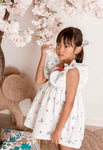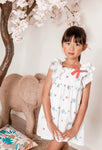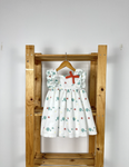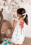 White summer dress in a cute sea motive print. It has ruffles around the arm openings and is adorned with a red ribbon on the front. It fastens with a red ribbon on the back. It comes with matching bloomers up to size 24 months.