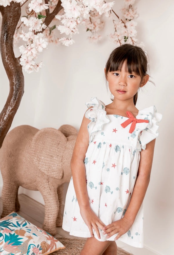 White summer dress in a cute sea motive print. It has ruffles around the arm openings and is adorned with a red ribbon on the front. It fastens with a...