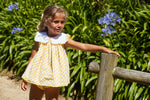 Cute dress for girls made in a diagonal white and yellow gingham pattern. It features a solid white square bib and flutter sleeves. It comes with matching elasticated bloomers and it fastens with buttons on the back.