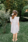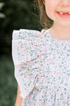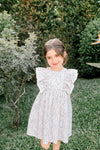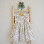 Perfect summer dress for little girls. Made in a subtle pink, green, blue and yellow floral print, it has double ruffles around the arm openings. It fastens on the back...