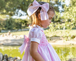 This hand-smocked pink dress is perfect for any special occasion or ceremony. It features a gorgeous smocked panel on the front, a Peter Pan smocked collar and puff sleeves. It ties on the back with a bow.