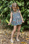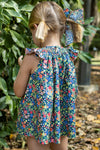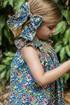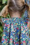 Hand-smocked bishop dress. Made in a colorful floral fabric over a navy background, it features a beautiful orange smock detail around the neckline and flutter sleeves. Made in cotton, it...