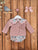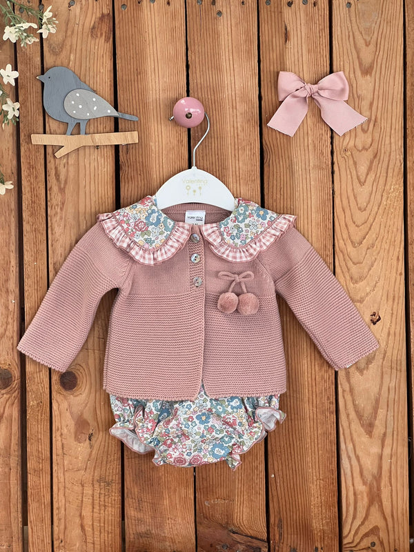 3-piece bloomer set for baby girls, it includes a blouse, a bloomer and a cardigan. The blouse and bloomer are made in a pink and green liberty-style floral cotton fabric. The blouse has long sleeves and an oversized Peter Pan collar with a contrasting pink and white gingham fabric print. It fastens with buttons on the back. The bloomers are elasticated around the waist and leg openings. The pink knitted cardigan fastens with buttons on the front and features a pompom. This set offers a lot of versatility as you can wear the full look or mix and match the pieces with other items to create different looks. There are matching options for girls up to 6 years old.