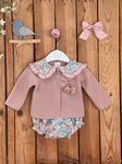 3-piece bloomer set for baby girls, it includes a blouse, a bloomer and a cardigan. The blouse and bloomer are made in a pink and green liberty-style floral cotton fabric....