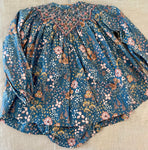 Beautiful hand-smocked bloomer set in a blue floral print. The long-sleeved dress fastens with mother-of-pearl buttons on the back. The bloomer is elasticated around the waist and leg openings.