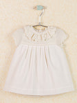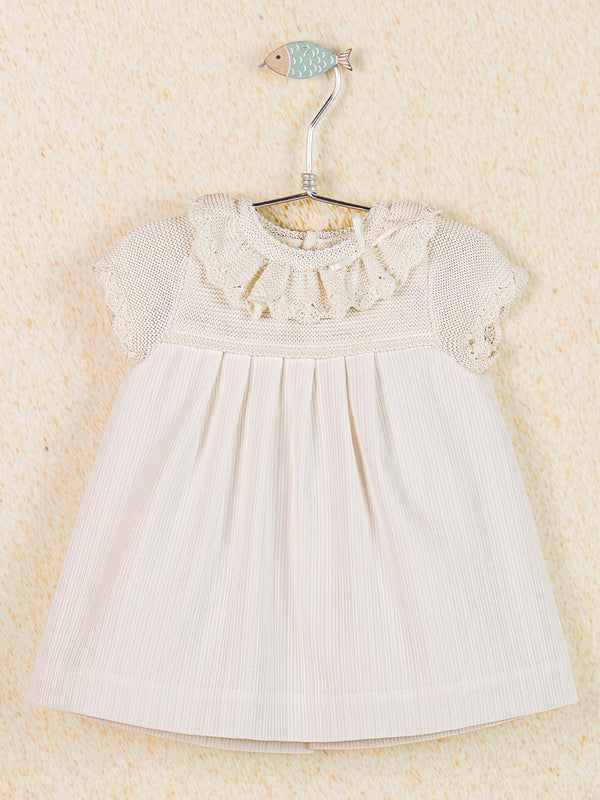 Traditional knit and woven ivory dress for baby girls. The body of the dress is knitted in delicate ivory cotton. It has short sleeves and a ruffled collar. The skirt...