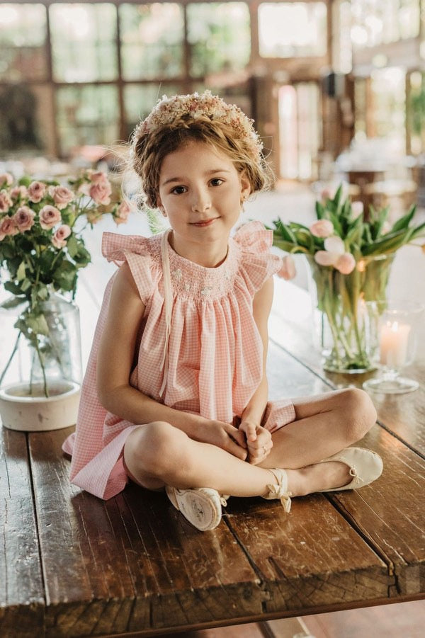 Beautiful hand smocked dress in a pink and white gingham fabric. It has a hand smocked flower detail around the collar. It fastens on the back with buttons.