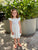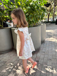 Gorgeous hand smocked white dress in a colorful floral print. This sleeveless dress features a hand smocked panel across the chest area. It fastens on the back with buttons and a bow.