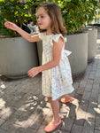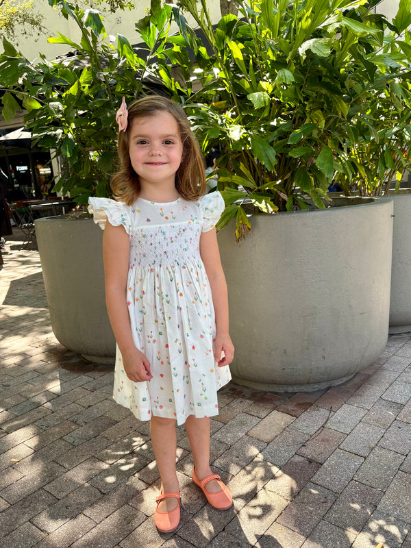 Gorgeous hand smocked white dress in a colorful floral print. This sleeveless dress features a hand smocked panel across the chest area. It fastens on the back with buttons and...